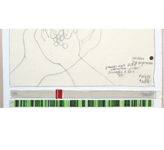 „Income’s Outcome is my new project tracking the money generated by the sale of each of it’s drawings. Each time a drawing is sold in the series, a window opens onto my life and I draw what I spent THAT money on. When the money is spent, the window closes. Each green stripe panel shows the income that was generated as well as a little cartoon of the drawing or drawings that were sold to generate that income. When a drawing is sold, I also make the next generation of that drawing which then becomes part of the series. This project will be exhibited in new incarnations quite a few times over the next year.“ (Danica Phelps 2012)