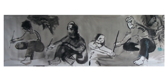 Andreas Huyskens hebt die Trennung von Malerei und Zeichnung auf. Wie ein Kalligraph führt er Pinsel und Rolle über die behandelte Leinwand. Mit einer Unmittelbarkeit, die sonst nur dem Zeichner eigen ist, entstehen Bilder des Malers in seinem Atelier, die im besten Sinne an die Intensität asiatischer Tuschemalerei erinnern.